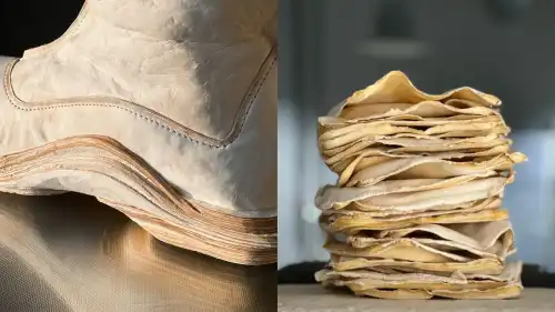 Уявіть собі цю співпрацю: з одного боку мікробіологи та дослідник-дизайнер Ларс Діттріх, які пораються зі своїми чашками Петрі, а з іншого — Марі Де Райк, провідний швець оперного театру, котра звикла мати справу зі шкірою, колодками й традиційним ремеслом. Два абсолютно різні світи об’єдналися, щоб примусити живий мікроорганізм набути форми функціонального взуття. На це знадобилося два роки. Два роки спроб перетворити матеріал, який в природі росте пласкими листами, на об'єкт, здатний витримати вагу людини.