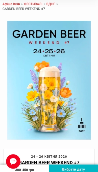 24–26 квітня – Garden Beer Weekend #7 – Київ У культурному просторі ВДНГ (Київ) Garden Beer Weekend #7 розпочнеться 24–26 квітня 2026 року для поціновувачів крафтового пива, вуличної їжі та музики просто неба. Цей захід навіть був включений в анонси квиткових сервісів як одна з найважливіших фестивальних подій весни.